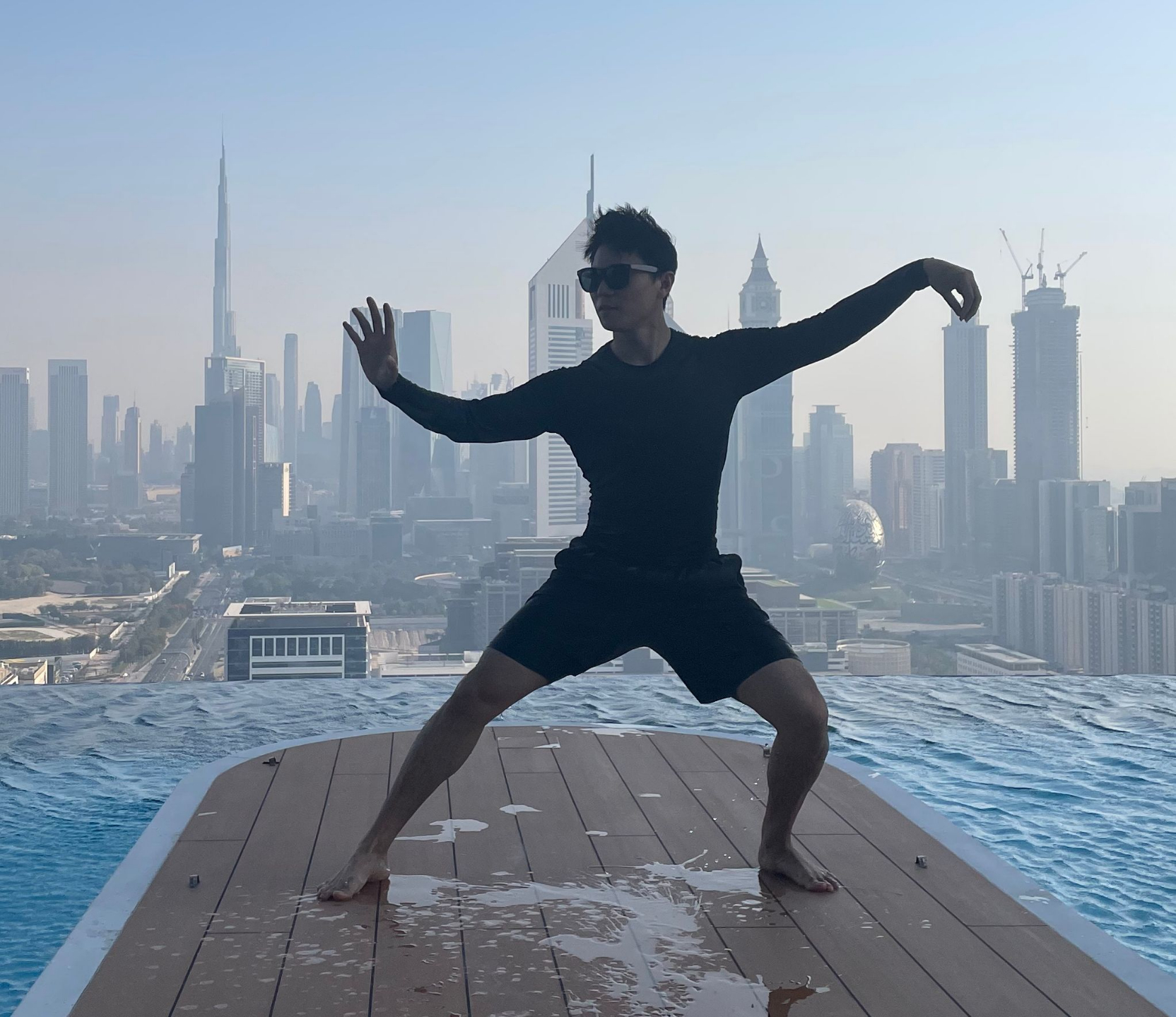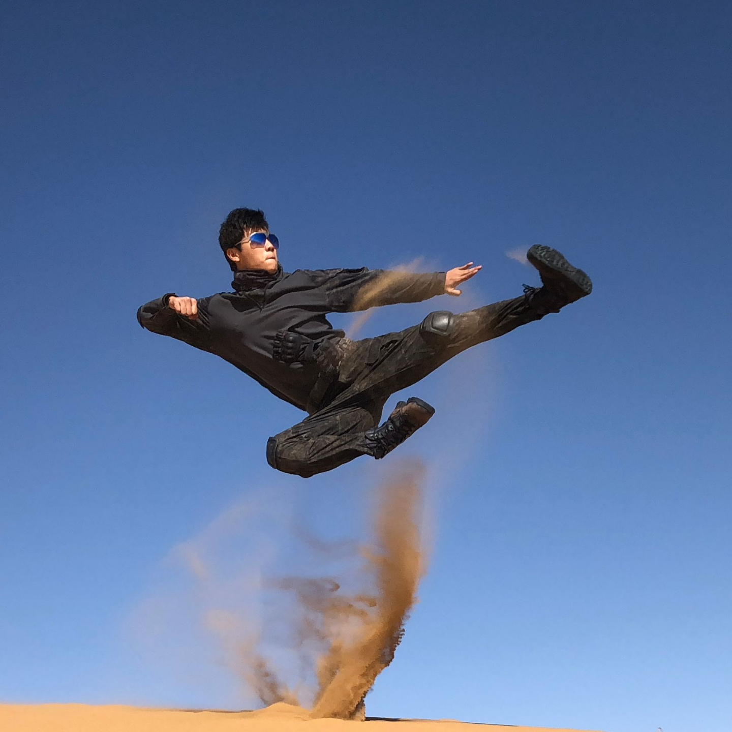 With over 20 years of martial arts practice experience, he is an 8th-generation member of Jackie Chan's stunt team and a national wushu champion.